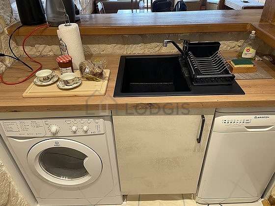 Questo appartamento dispone di una bella cucina adiacent al soggiorno con del piastrelle al suolo e tutto l'equipaggiamento indispensabile per la vita quotidiana : piani di cottura, frigorifero, congelatore, microonde multifunzione, cappa di aspirazione, armadio, stoviglie, bar.