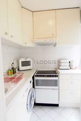 Questo appartamento dispone di una cucina con del piastrelle al suolo e tutto l'equipaggiamento essenziale per la vita quotidiana : piani di cottura, frigorifero, congelatore, forno, forno microonde, cappa di aspirazione, tostapane, bollitore elettrico, caffettiera, armadio, stoviglie.