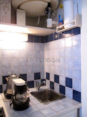 Questo appartamento dispone di una cucina con del piastrelle al suolo e tutto l'equipaggiamento indispensabile per la vita quotidiana : piani di cottura, frigorifero, forno microonde, congelatore, tostapane, bollitore elettrico, caffettiera, armadio, stoviglie.