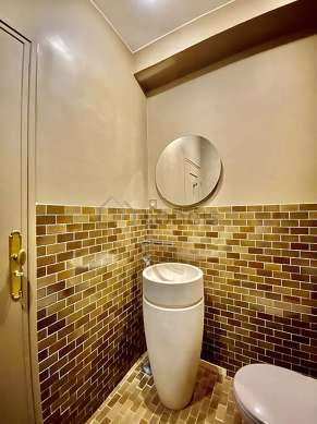 Questo appartamento é equipaggiato di un bagno magnifica e molto chiaro with finestras. Questo bagno é dotato di tutto il necessario per il tuo benessere quotidiano : asciugamani da bagno, scaffale, doccia, asciugacapelli. Il WC é integrato nel bagno