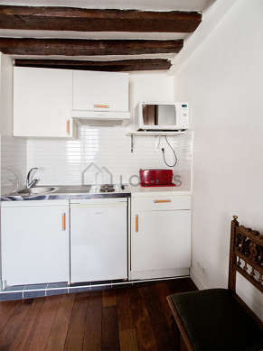 Questo appartamento dispone di una cucina con del parquet al suolo e tutto l'equipaggiamento necessario per la vita quotidiana : piani di cottura, frigorifero, forno microonde, congelatore, cappa di aspirazione, bollitore elettrico, caffettiera, armadio, stoviglie.