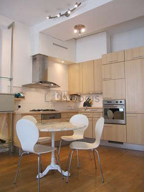 Questo appartamento dispone di una magnifica cucina con del parquet al suolo e tutto l'equipaggiamento necessario per la vita quotidiana : piani di cottura, frigorifero, congelatore, forno, forno microonde, cappa di aspirazione, tostapane, bollitore elettrico, caffettiera, scaffale, armadio, stoviglie, robot da cucina.