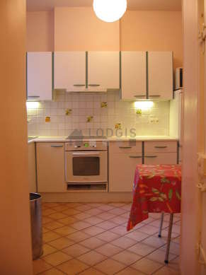 Questo appartamento dispone di una bella cucina con del piastrelle al suolo e tutto l'equipaggiamento essenziale per la vita quotidiana : piani di cottura, frigorifero, congelatore, forno, forno microonde, tavola da pranzo, armadio, stoviglie, sgabello.