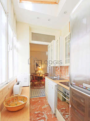Questo appartamento dispone di una cucina con del marmo al suolo e tutto l'equipaggiamento indispensabile per la vita quotidiana : piani di cottura, frigorifero, congelatore, forno, forno microonde, tostapane, bollitore elettrico, caffettiera, armadio, stoviglie.