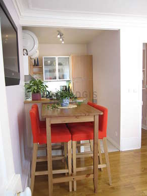 Questo appartamento dispone di una bella cucina con del piastrelle al suolo e tutto l'equipaggiamento essenziale per la vita quotidiana : piani di cottura, frigorifero, forno microonde, congelatore, cappa di aspirazione, tostapane, bollitore elettrico, caffettiera, armadio, stoviglie, sgabello, bar.