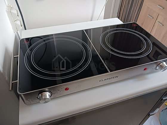Questo appartamento dispone di una cucina con del piastrelle al suolo e tutto l'equipaggiamento essenziale per la vita quotidiana : piani di cottura, frigorifero, forno microonde, congelatore, caffettiera, scaffale, armadio, stoviglie, sgabello, bar.