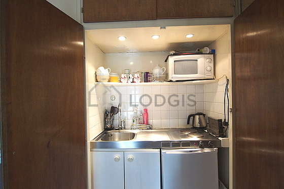 Questo appartamento dispone di una cucina adiacent al soggiorno e tutto l'equipaggiamento essenziale per la vita quotidiana : piani di cottura, frigorifero, forno microonde, congelatore, tostapane, bollitore elettrico, caffettiera, scaffale, stoviglie.