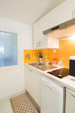 Questo appartamento dispone di una bella cucina adiacent al soggiorno con del piastrelle al suolo e tutto l'equipaggiamento essenziale per la vita quotidiana : piani di cottura, frigorifero, microonde multifunzione, congelatore, cappa di aspirazione, tostapane, bollitore elettrico, caffettiera, armadio, stoviglie.