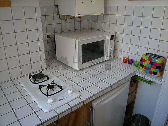 Questo appartamento dispone di una bella cucina con del piastrelle al suolo e tutto l'equipaggiamento indispensabile per la vita quotidiana : piani di cottura, frigorifero, microonde multifunzione, congelatore, tostapane, armadio, stoviglie.
