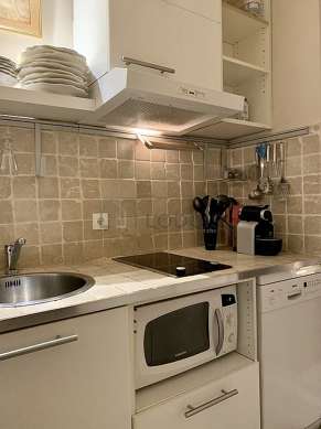 Questo appartamento dispone di una bella cucina con della moquette al suolo e tutto l'equipaggiamento essenziale per la vita quotidiana : piani di cottura, frigorifero, forno microonde, cappa di aspirazione, tostapane, bollitore elettrico, caffettiera, scaffale, stoviglie.