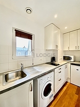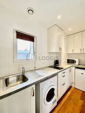 Questo appartamento dispone di una bella cucina con del parquet al suolo e tutto l'equipaggiamento necessario per la vita quotidiana : piani di cottura, frigorifero, forno microonde, congelatore, bollitore elettrico, caffettiera, armadio, stoviglie.