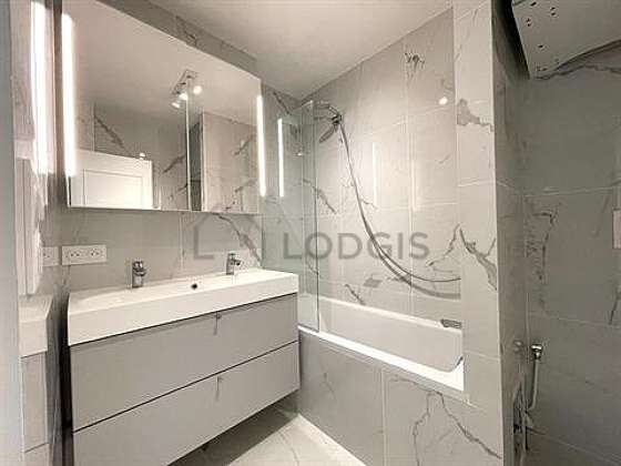 Parc Monceau, 8ème, au 5ème étage avec ascenseur d'un immeuble moderne ravalé avec gardien, un appartement meublé 3 pièces entièrement rénové composé d'une belle entrée avec rangements, un séjour / salle à manger avec cuisine américaine entièrement équipée, deux chambres de bonne taille avec rangements, une salle de bains avec double vasque, toilettes séparées, cave.