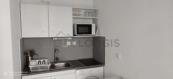 Este apartamento tem uma cozinha e todo o equipamento pela sua vida quotidiana : fogaõ, frigorífico, microondas.