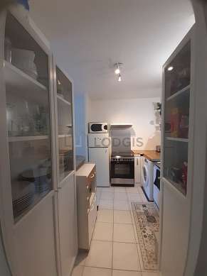 Este apartamento tem uma cozinha e todo o equipamento pela sua vida quotidiana : torradeira, chaleira, máquina de café.