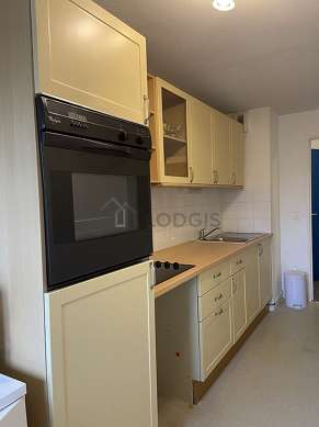 Este apartamento tem uma cozinha com linoleo no piso e todo o equipamento pela sua vida quotidiana : fogaõ, forno, mesa de jantar, armário, loiça.