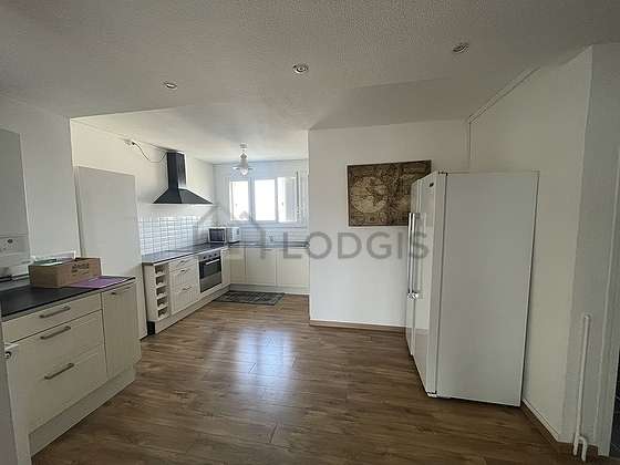 Este apartamento tem uma magnífico cozinha com parqué no piso e todo o equipamento pela sua vida quotidiana : fogaõ, congelador, forno, micro-ondas combinado, exaustur, armário.