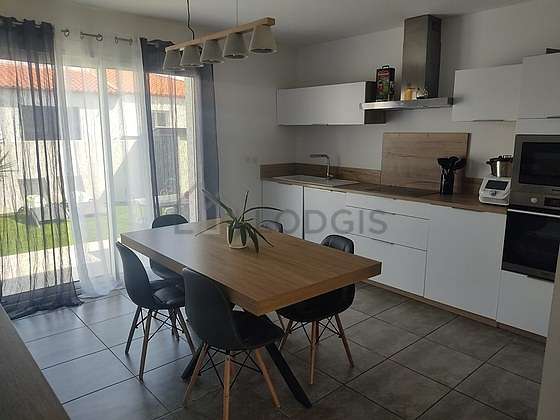 Esta casa tem uma magnífico cozinha com azuleijo no piso e todo o equipamento pela sua vida quotidiana : fogaõ, frigorífico, forno, microondas, exaustur, mesa de jantar, armário, 1 cadeira(s).