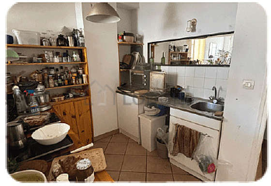 Este dúplex tem uma cozinha e todo o equipamento pela sua vida quotidiana : fogaõ, frigorífico, forno, chaleira, máquina de café, armário, sink, bin.