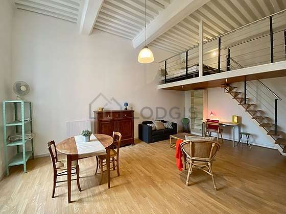 Graças a sua altura de teto, um mezanino foi possível de ser instalado em este apartamento , oferecendo-lhe uma verdadeira peça suplementar equipada de lençois, colchas.