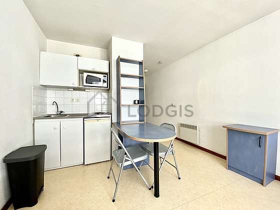 Este apartamento tem uma cozinha e todo o equipamento pela sua vida quotidiana : fogaõ, frigorífico, microondas, armário, 2 cadeira(s).