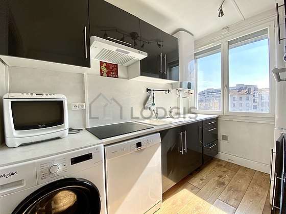 Este apartamento tem uma cozinha e todo o equipamento pela sua vida quotidiana : fogaõ, frigorífico, congelador, microondas, exaustur, chaleira, máquina de café, armário, loiça.