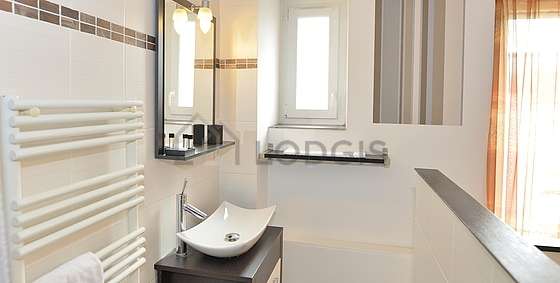 Este apartamento é equipado de uma casa de banho. Esta sala de água dispõe do necessário pelo seu bem estar na sua vida quotidiana : ducheiro separado, sink, radiator secador de toalhas. Os WC são separados da casa de banho e situados em uma peça independente.