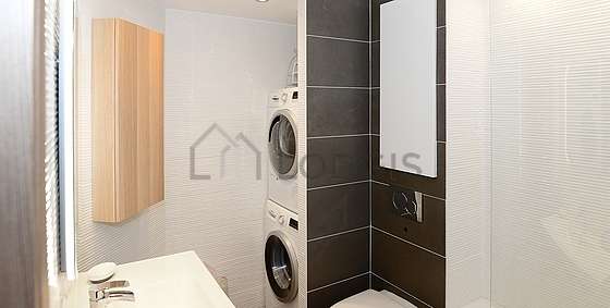 Este apartamento é equipado de uma casa de banho. Esta sala de água dispõe do necessário pelo seu bem estar na sua vida quotidiana : armário, ducheiro separado, sink, radiator secador de toalhas. Os WC são separados da casa de banho e situados em uma peça independente.