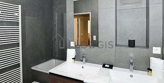 Este apartamento é equipado de uma casa de banho. Esta sala de água dispõe do necessário pelo seu bem estar na sua vida quotidiana : toalhas de banho, ducheiro separado, sink, radiator secador de toalhas. Os WC são integrados na casa de banho.