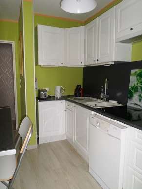 Este apartamento tem uma cozinha e todo o equipamento pela sua vida quotidiana : fogaõ, frigorífico, congelador, exaustur, torradeira, chaleira, máquina de café, armário, loiça.