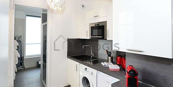 Este apartamento tem uma cozinha e todo o equipamento pela sua vida quotidiana : fogaõ, frigorífico, congelador, microondas, torradeira, chaleira, máquina de café, loiça, bin.