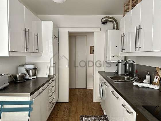 Este apartamento tem uma cozinha com azuleijo no piso e todo o equipamento pela sua vida quotidiana : fogaõ, frigorífico, congelador, forno, microondas, exaustur, torradeira, chaleira, máquina de café, mesa de jantar, loiça, electrodomésticos, 1 cadeira(s), banco.