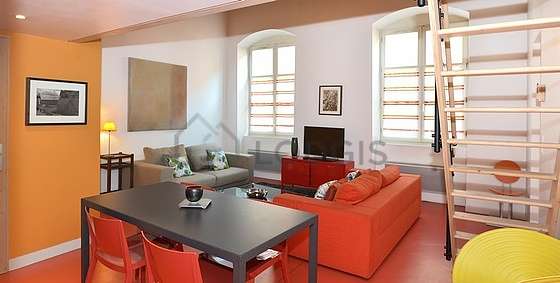 SalaõEste apartamento é composto de um salão janelas vitros duplos. Este salão mobiliado et equipado para uma agradável estância : televisaõ, roupa de cama, mesa de jantar, mesinha, biblioteca, prateleira, pedras aparentes.