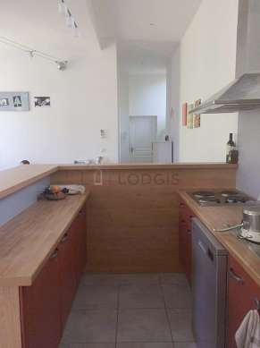 Este apartamento tem uma cozinha e todo o equipamento pela sua vida quotidiana : fogaõ, frigorífico, microondas, loiça.