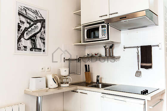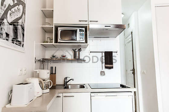 Este apartamento tem uma magnífico cozinha com parqué no piso e todo o equipamento pela sua vida quotidiana : fogaõ, frigorífico, microondas, freezer, exaustur, chaleira, prateleira, armário, loiça.
