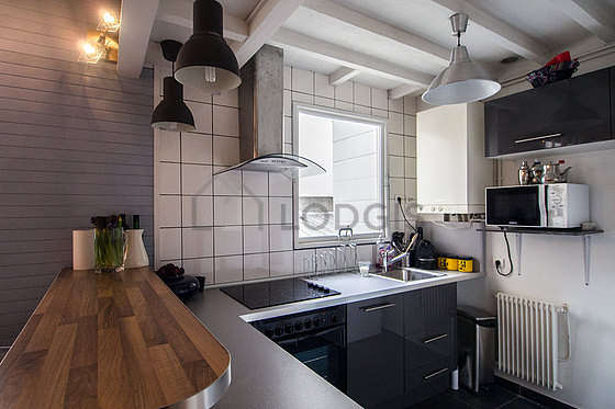 Este apartamento tem uma bonita cozinha com azuleijo no piso e todo o equipamento pela sua vida quotidiana : fogaõ, frigorífico, congelador, forno, microondas, exaustur, máquina de café, prateleira, armário, loiça, bar.