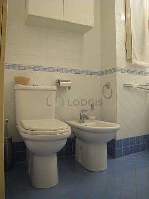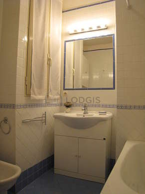 Este apartamento é equipado de uma casa de banho agradável with janelas. Esta sala de água dispõe do necessário pelo seu bem estar na sua vida quotidiana : toalhas de banho, armário, banheira, secador, radiator secador de toalhas. Os WC são integrados na casa de banho.