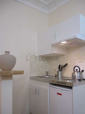 Este apartamento tem uma bonita cozinha perto do salaõ com parqué no piso e todo o equipamento pela sua vida quotidiana : fogaõ, frigorífico, freezer, exaustur, torradeira, máquina de café, armário, loiça, banco, bar.