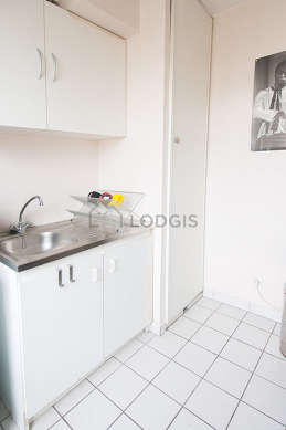 Este apartamento tem uma cozinha com azuleijo no piso e todo o equipamento pela sua vida quotidiana : fogaõ, frigorífico, micro-ondas combinado, armário, loiça, banco, bar.