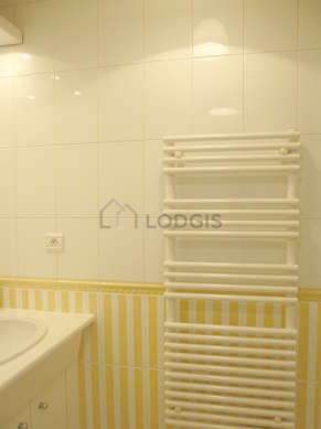 Este apartamento é equipado de uma casa de banho agradável. Esta sala de água dispõe do necessário pelo seu bem estar na sua vida quotidiana : toalhas de banho, armário, ducheiro separado, radiator secador de toalhas. Os WC são separados da casa de banho e situados em uma peça independente.