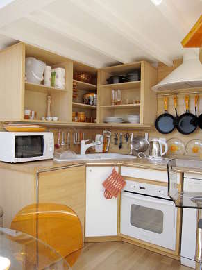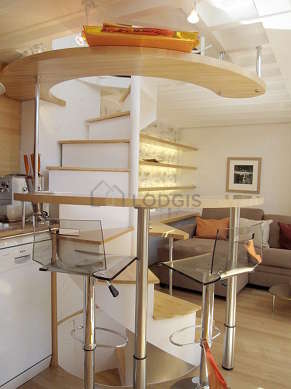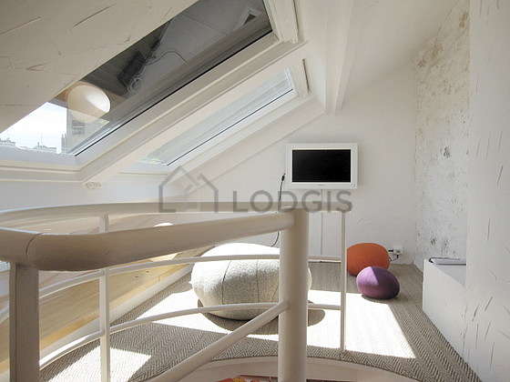 Graças a sua altura de teto, um mezanino foi possível de ser instalado em este apartamento , oferecendo-lhe uma verdadeira peça suplementar equipada de televisaõ, lençois, colchas, mesinha.