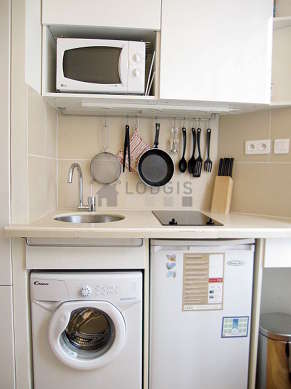 Este apartamento tem uma bonita cozinha com parqué no piso e todo o equipamento pela sua vida quotidiana : fogaõ, frigorífico, microondas, freezer, torradeira, chaleira, máquina de café, mesa de jantar, armário, loiça, 2 cadeira(s).