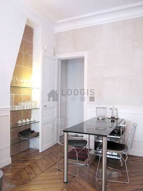 Este apartamento tem uma magnífico cozinha perto do salaõ com parqué no piso e todo o equipamento pela sua vida quotidiana : fogaõ, frigorífico, forno, microondas, freezer, torradeira, chaleira, máquina de café, mesa de jantar, prateleira, armário, loiça, 2 cadeira(s).