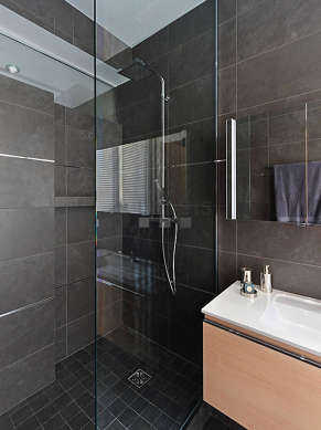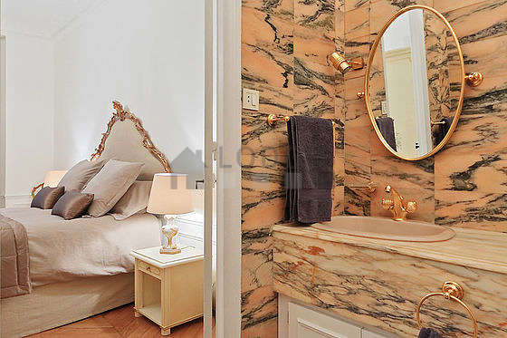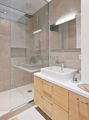 Este apartamento é equipado de uma casa de banho magnífico. Esta sala de água dispõe do necessário pelo seu bem estar na sua vida quotidiana : toalhas de banho, armário, ducheiro separado, radiator secador de toalhas. Os WC são separados da casa de banho e situados em uma peça independente.