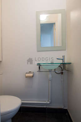 Este apartamento é equipado de uma casa de banho magnífico é clara. Esta sala de água dispõe do necessário pelo seu bem estar na sua vida quotidiana : toalhas de banho, armário, banheira, airer, sink, mirror, work surface, radiator secador de toalhas. Os WC são separados da casa de banho e situados em uma peça independente.