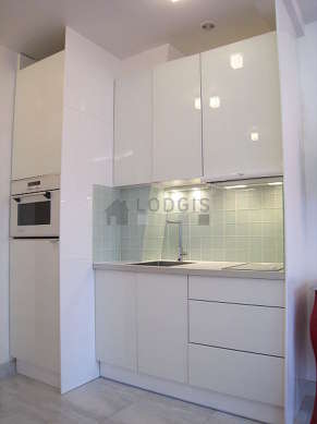 Este apartamento tem uma magnífico cozinha com azuleijo no piso e todo o equipamento pela sua vida quotidiana : fogaõ, frigorífico, forno, freezer, exaustur, chaleira, máquina de café, armário, loiça.