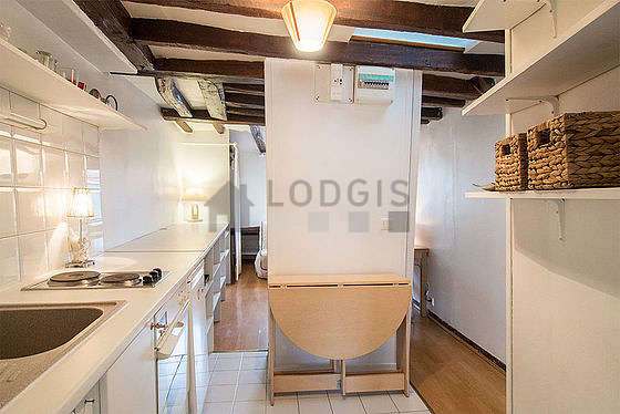 Este apartamento tem uma bonita cozinha com azuleijo no piso e todo o equipamento pela sua vida quotidiana : fogaõ, frigorífico, congelador, forno, chaleira, mesa de jantar, prateleira, loiça.