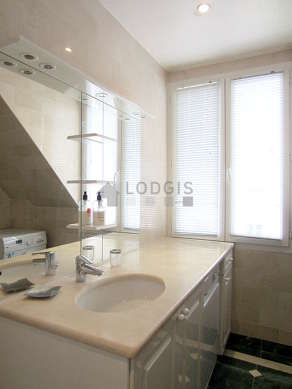 Este apartamento é equipado de uma casa de banho agradável é muito clara with janelas. Esta sala de água dispõe do necessário pelo seu bem estar na sua vida quotidiana : toalhas de banho, armário, secador, duche balneo, radiator secador de toalhas. Os WC são integrados na casa de banho.
