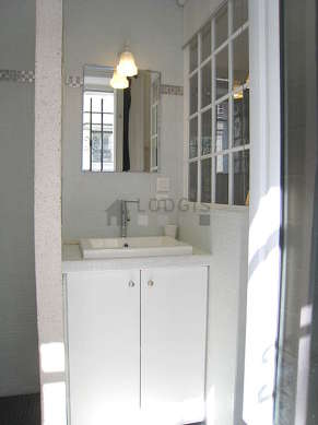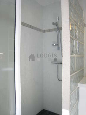 Este apartamento é equipado de uma casa de banho agradável with janelas vitros duplos. Esta sala de água dispõe do necessário pelo seu bem estar na sua vida quotidiana : toalhas de banho, armário, ducheiro separado, secador. Os WC são separados da casa de banho e situados em uma peça independente.