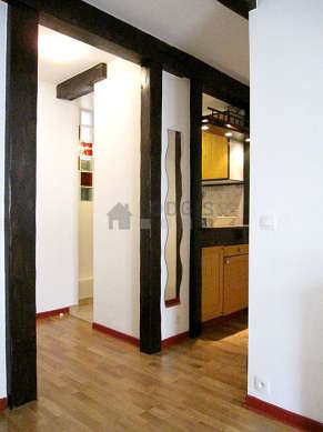 Este apartamento é composto de um atraente salão com parqué no piso é janelas vitros duplos é vista sobre rua. Este salão calmo mobiliado et equipado para uma agradável estância : televisaõ, sofá, mesa de jantar, mesinha, secretária, prateleira, pedras aparentes, 3 cadeira(s).
