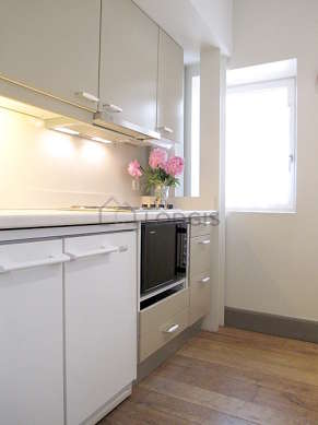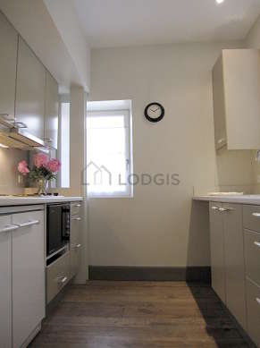 Este apartamento tem uma magnífico cozinha com parqué no piso e todo o equipamento pela sua vida quotidiana : fogaõ, frigorífico, congelador, micro-ondas combinado, exaustur, máquina de café, armário, loiça.